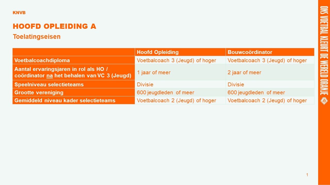 Het diploma Hoofd Opleiding A wordt toegekend aan hen, die alle Proeven van Bekwaamheden met goed gevolg hebben afgelegd. Het opleidingsprogramma en de beschrijvingen van de diverse Proeven van Bekwaamheden zijn terug te vinden in de digitale leeromgeving Dugout.