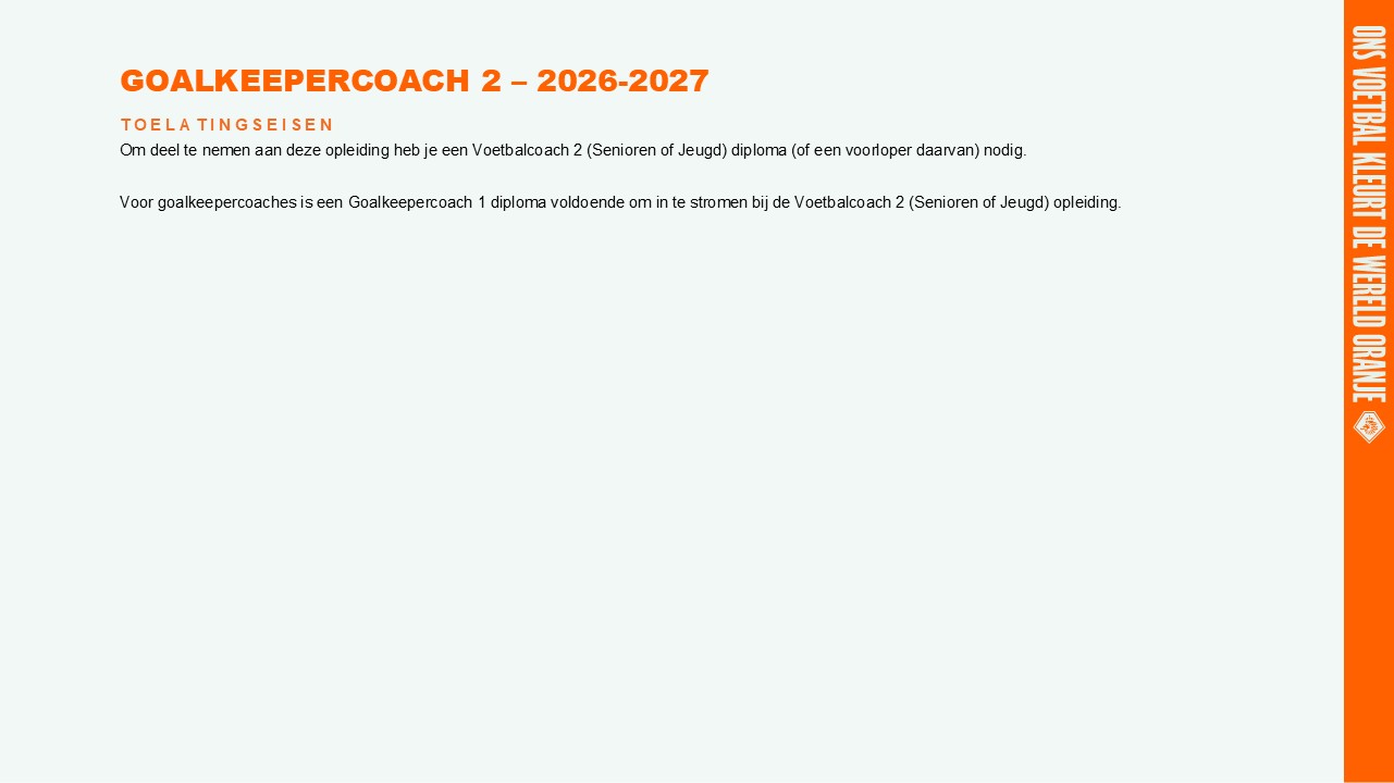 De kandidaat is toelaatbaar als deze in bezit is van een Voetbalcoach 2 Senioren of Voetbalcoach 2 Jeugd diploma (of een voorloper hiervan).