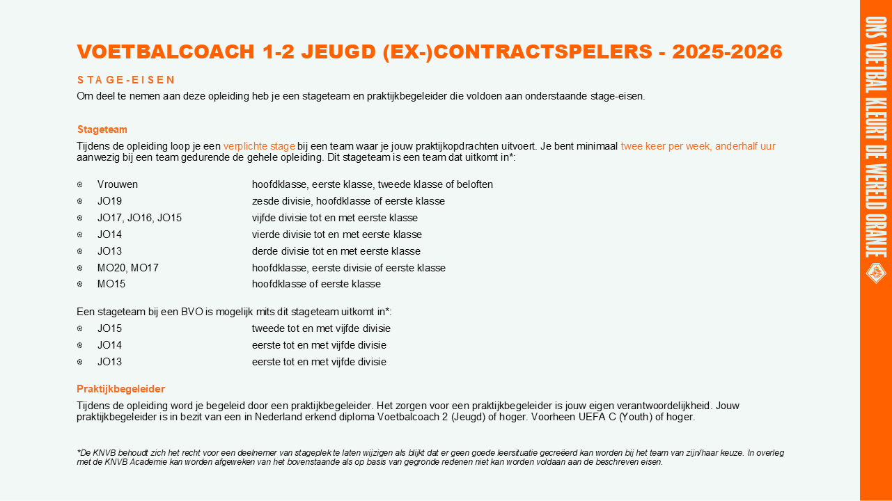 Het opleidingsgedeelte bestaat uit 13 bijeenkomsten. De bijeenkomsten vinden in de regel wekelijks plaats op dinsdagen en/of woensdagen van 15.00 – 21.00 uur. Houd er rekening mee dat de bijeenkomsten verspreid door het land plaats kunnen vinden, dit is afhankelijk van de stage clubs van de deelnemers. De opleiding start met een opstartbijeenkomst in juni 2025, daarna vervolgt de opleiding in september ’25. De gehele opleiding duurt één seizoen. Je dient volledig aanwezig te zijn bij alle bijeenkomsten.