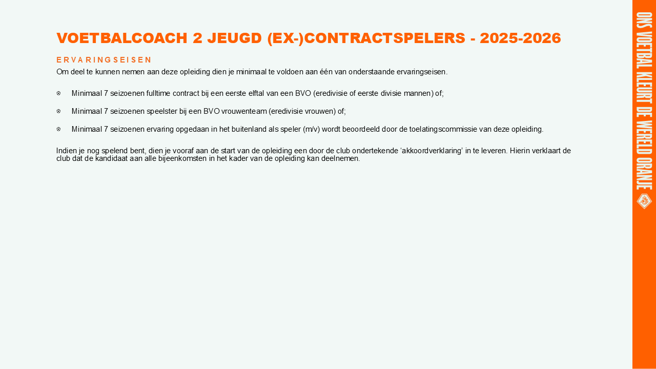 Indien je niet voldoet aan deze toelatingseisen, is mogelijk de opleiding Voetbalcoach 1-2 Jeugd voor (ex) contractspelers een optie voor jou. Hiervoor dien je minimaal 60 wedstrijden fulltime betaald voetbal te hebben gespeeld (Ere- of 1e divisie mannen of Eredivisie vrouwen) of 20 A-interlands. Ga naar de pagina Voetbalcoach 1-2 Jeugd voor (ex-)contractspelers voor meer informatie
