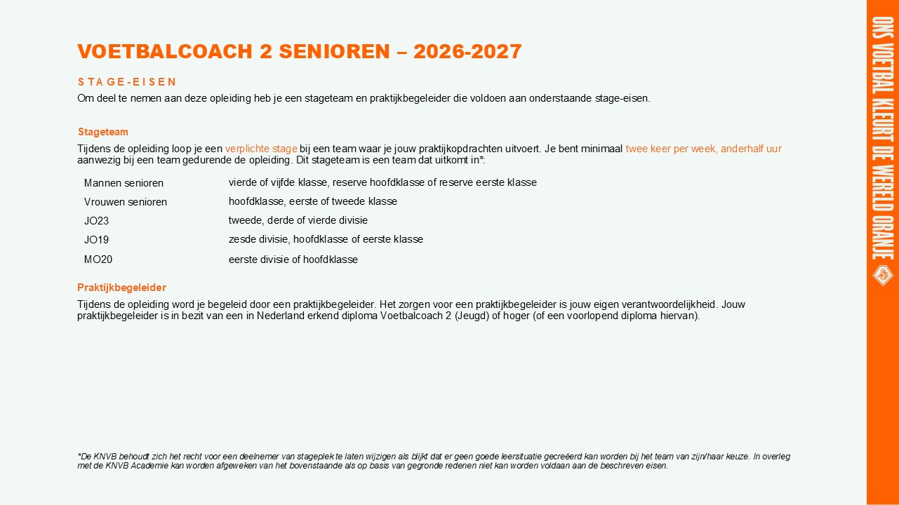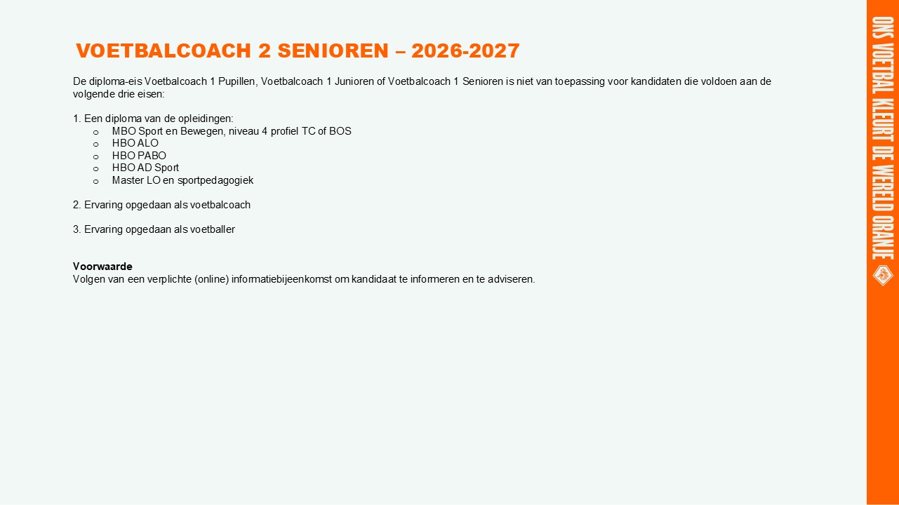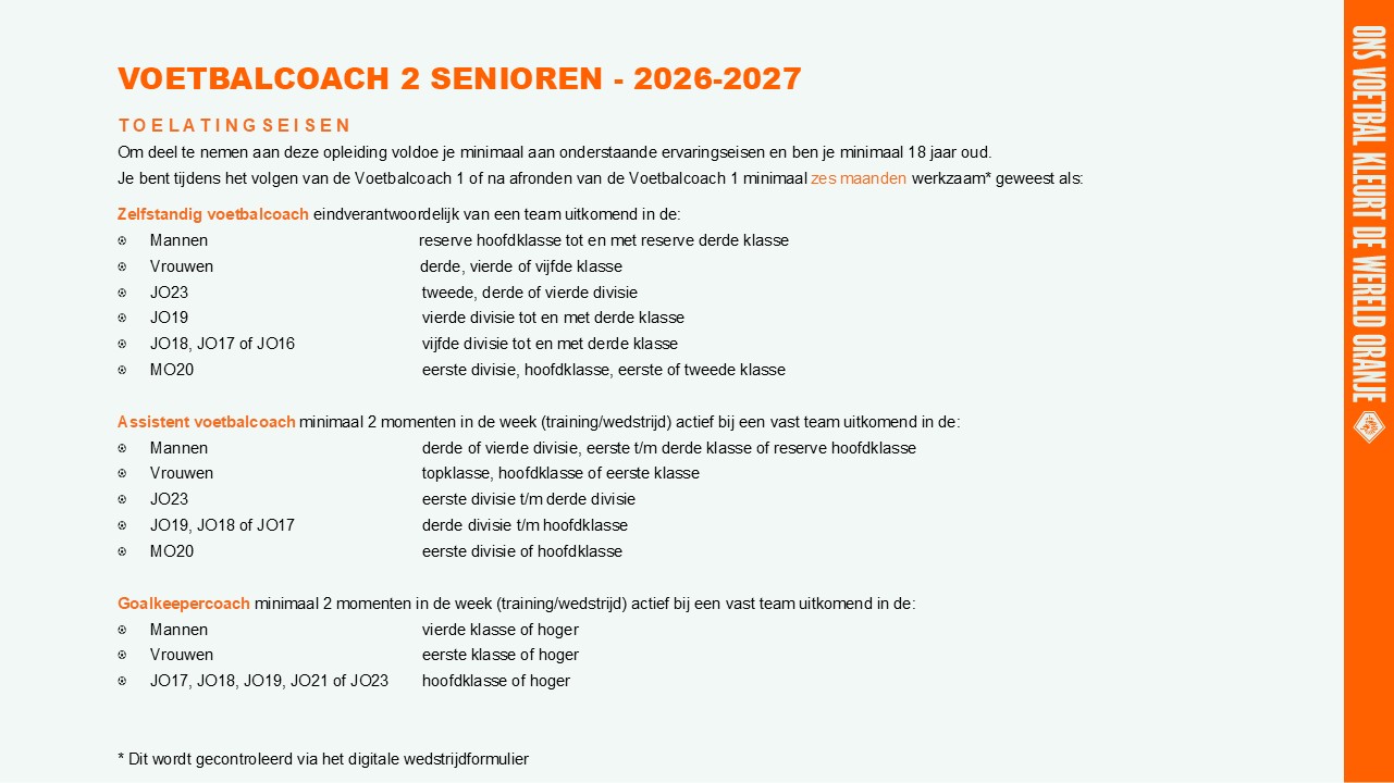Inschrijven voor de opleiding Voetbalcoach 2 Senioren in seizoen 2026/'27 is mogelijk vanaf woensdag 8 april 2026 om 11.00 uur.