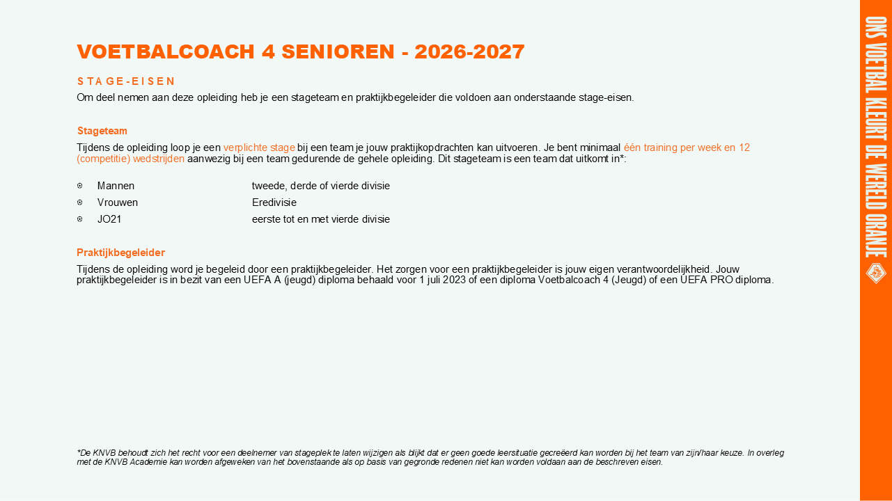 Tijdens de opleiding loop je een verplichte stage bij een team je jouw praktijkopdrachten kan uitvoeren. Je bent minimaal één training per week en 12 (competitie) wedstrijden aanwezig bij een team gedurende de gehele opleiding. Dit stageteam is een team dat uitkomt in*: