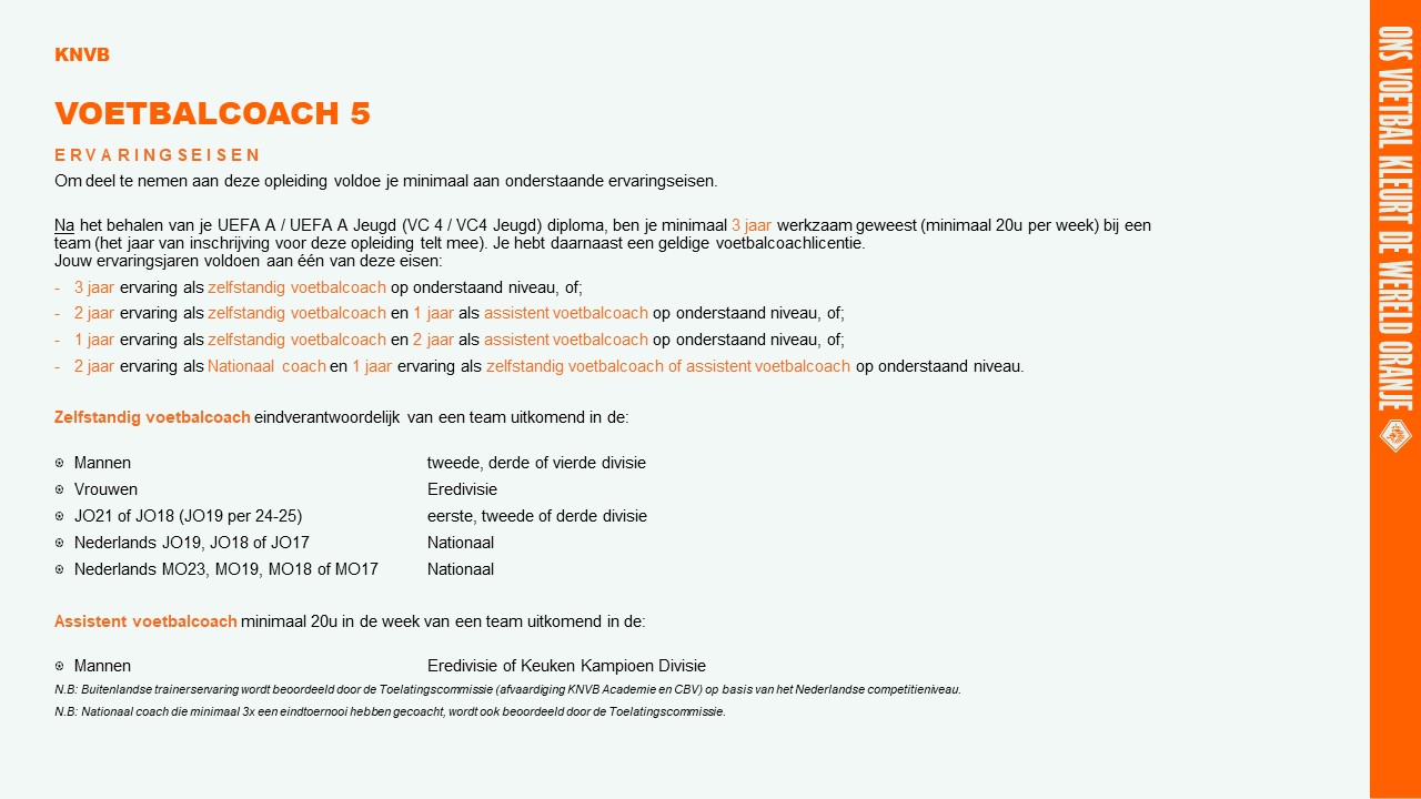 Om beter aan te sluiten bij de veranderende wereld van het betaalde voetbal is in de laatste jaren de opleiding Voetbalcoach 5 vernieuwd. Dit past bij de hoge eisen die, zowel binnen als buiten het veld, aan de voetbalcoach in het Betaald Voetbal worden gesteld. De UEFA en de KNVB trekken van oudsher samen op om deze opleiding actueel en kwalitatief op het hoogste niveau te houden. Dit heeft bijgedragen aan de goede naam van de KNVB-opleidingen in Europa.