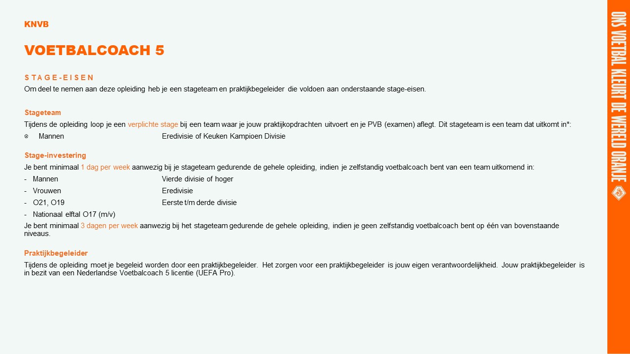 Tijdens de opleiding moet je begeleid worden door een praktijkbegeleider. Het zorgen voor een praktijkbegeleider is jouw eigen verantwoordelijkheid. Jouw praktijkbegeleider is in bezit van een Nederlandse Voetbalcoach 5 licentie (UEFA Pro).