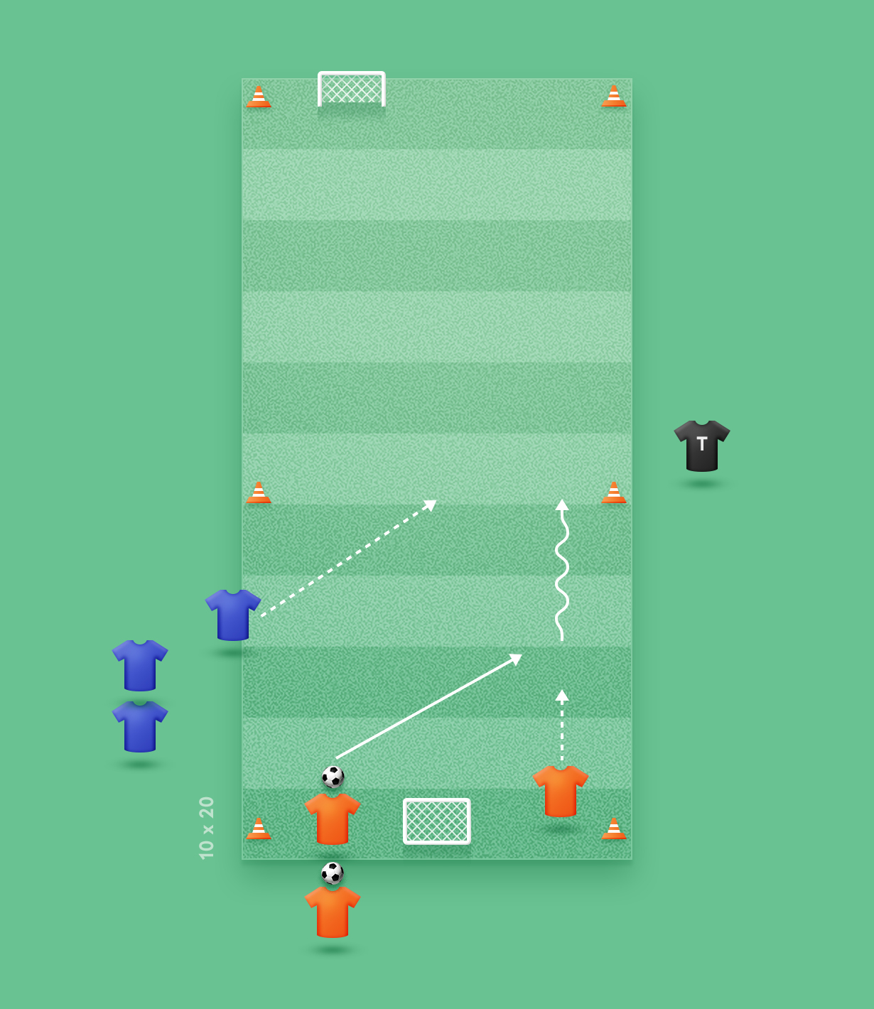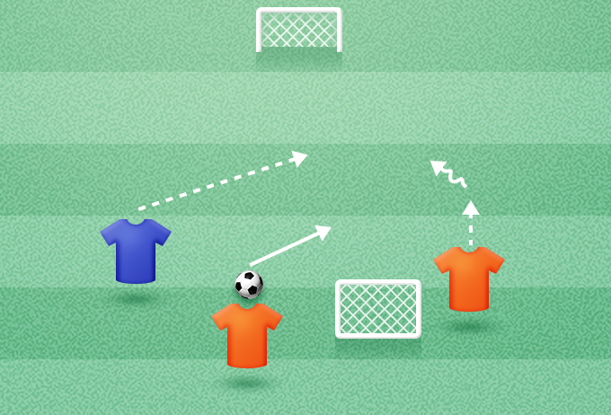 • Aanvallende team speelt een schuine pass in de loop van medespeler. Deze neemt de bal voorwaarts mee en speelt 1-tegen-1 tegen de verdediger die komt inlopen vanaf de zijkant