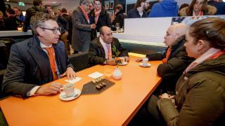 Jan Dirk van der Zee en Michael van Praag in gesprek met vrijwilligers tijdens de actie Jouw Vrijwilliger in Oranje in 2016.
