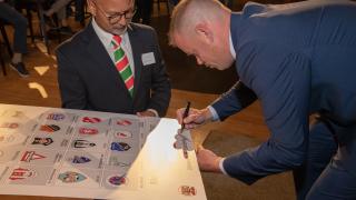 Vertegenwoordigers van 22 van de 25 clubs in Enschede ondertekenden woensdagavond het manifest 'Voetballen met plezier' in het stadion van FC Twente. - Foto: Rutger Stiekema