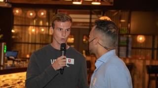 FC Twente-aanvoerder Peet Bijen wordt aan de tand gevoeld door presentator Özcan Akyol. — Foto: Rutger Stiekema