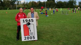 Willy Ederveen (links) en Niek Jacobs met het bijzondere clublogo van RKSV Driel. - Foto: KNVB Media