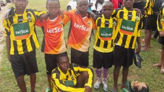 Burundese kinderen in shirts van de Almelose voetbalclub PH.