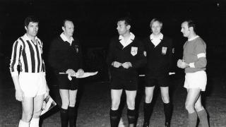 Frans Vermeij (tweede rechts) bij de toss voorafgaand aan Juventus - Újpest Dósza in 1972.