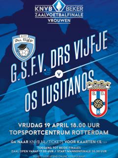 Vrijdag 19 april staat niet alleen de finale van de mannen op het programma in het Rotterdamse Topsportcentrum. Ook de vrouwen spelen deze avond de KNVB Bekerfinale. Die gaat dit jaar tussen G.S.F.V. drs Vijfje en Os Lusitanos. Om 18.00 uur staan beide ploegen aan de aftrap. De studentes uit Groningen spelen voor het eerst in hun bestaan de KNVB Bekerfinale. In de halve finale (1-1) waren zij na strafschoppen te sterk voor Drachtster Boys. Os Lusitanos bereikte de eindstrijd door een 1-4 zege op KTP Nieuw Roden.