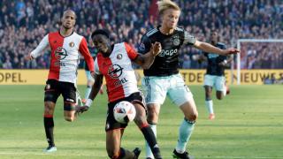 Ajax-spits Kasper Dolberg, hier in duel met Terence Kongolo van Feyenoord, is gedeeld topscorer.