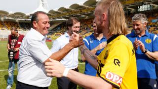 Huub Stevens en Nathan Rutjes vieren de handhaving van Roda JC in de Eredivisie. - Foto: KNVB Media