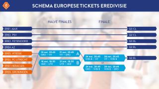 FC Groningen neemt het daarin aanstaande zaterdag als eerste in een thuiswedstrijd op tegen Vitesse. Drie dagen later is de return, in Arnhem. FC Utrecht en Heracles Almelo nemen het in de andere dubbele confrontatie tegen elkaar op. De winnaars van de halve finales spelen op 24 en 28 mei om een ticket in de tweede voorronde van de Europa League.
