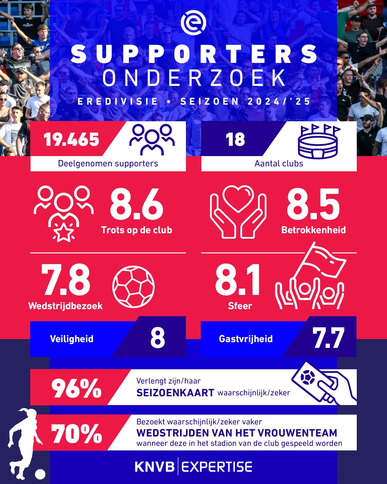 95% van de seizoenkaarthouders wil in het nieuwe seizoen opnieuw een seizoenkaart van hun club in de Eredivisie, Keuken Kampioen Divisie of Azerion Vrouwen Eredivisie aanschaffen. Bij 79% is dit zeker, 16% vindt dit waarschijnlijk. In totaal 45% van de stadionbezoekers zonder seizoenkaart overweegt om dit voor het volgend seizoen ook te doen.