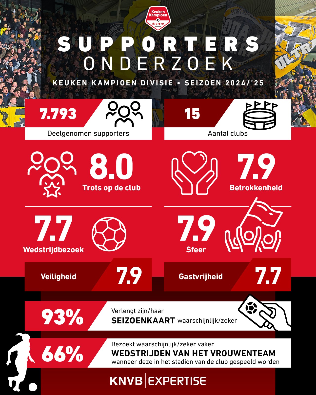 Dat blijkt uit een enquête onder in totaal 28.152 bezoekers van het betaald voetbal. De sfeer wordt gewaardeerd met een 8,1. De open antwoorden van de enquête onderstrepen dit: 'mooie acties door de supporters', 'veel enthousiasme bij de fans' en 'het geeft een positieve vibe'.