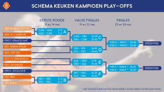 Acht ploegen gaan in de komende twee weken uitmaken wie de laatste twee plekken in de Eredivisie voor volgend seizoen invullen. Na de laatste speelronde in de Eredivisie is het schema definitief geworden voor de Keuken Kampioen Play-offs.