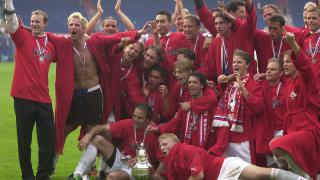 FC Utrecht viert de overwinning in de finale van het toernooi om de KNVB beker in 2003.