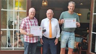 Gerard Krab en Marco Lokhorst hebben op zaterdag 26 mei een gouden speld van de KNVB ontvangen voor al hun vrijwillige verdiensten voor v.v. AZVN. - Foto: KNVB Media