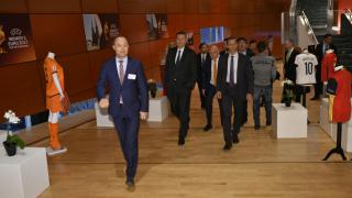 Toernooidirecteur Bert van Oostveen, bondsvoorzitter Michael van Praag en UEFA-voorzitter Aleksander Ceferin in het Luxor Theater. - Foto: KNVB Media