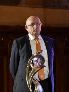 Bondsvoorzitter Michael van Praag met de trofee waar het de komende weken allemaal om draait.