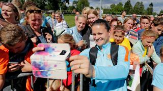 Selfies, handtekeningen en applaus. Oranjefans kwamen vrijdag naar de openbare training in De Lutte om een glimp van de Leeuwinnen op te vangen. - Foto: KNVB Media
