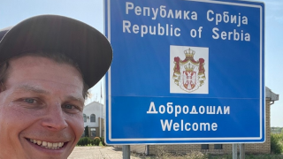 Laurens Jagt op de grens met Servië; hij heeft inmiddels Bulgarije al bereikt. - Foto: Eigen foto