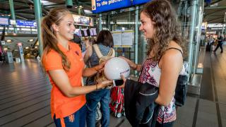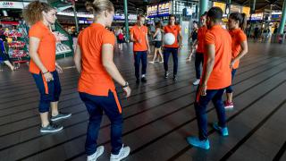 Om het zojuist getekende sponsorcontract met Intersport te vieren, deelden de internationals van het Nederlands vrouwenelftal maandag ballen uit aan het reizende publiek op Schiphol. Vlak voor vertrek naar Atlanta, waar Oranje zondag een oefeninterland speelt tegen wereldkampioen Verenigde Staten, liepen voorbijgangers de OranjeLeeuwinnen tegen het lijf.