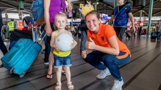Lieke Martens overhandigt een Intersport-bal aan een jonge reiziger op Schiphol.
