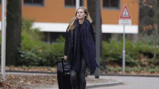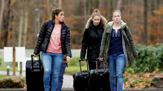 Angela Christ komt samen met debutanten Sisca Folkertsma en Michelle Hendriks aan in Zeist. - Foto: KNVB Media
