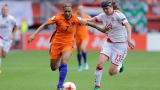 Shanice van de Sanden in duel met de Deense Sofie Pedersen. - Foto: KNVB Media