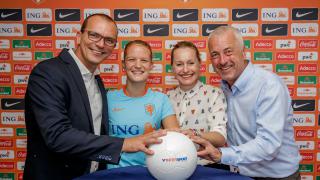 Jan Willem Juffer (directeur Intersport), Oranje-aanvoerster Mandy van den Berg, Minke Booij (manager Vrouwenvoetbal) en Jean-Paul Decossaux (directeur commerciële zaken betaald voetbal) - Foto: KNVB Media