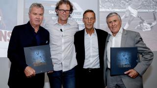 Uit handen van Guus Hiddink ontving Johan Neeskens het eerste exemplaar van het boek over hem. - Foto: KNVB Media