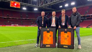 Op de foto (v.l.n.r.) Chiel Evers, projectleider veiligheid Stadion Feijenoord, Chris van de Poll (KNVB), Vincent van Leeuwen, coördinator crowd operations Johan Cruijff ArenA en Jordi Schuls, coördinator stewarding Johan Cruijff ArenA. De stewards van het Phillips Stadion zullen op een later tijdstip eenzelfde ingelijst shirt krijgen.