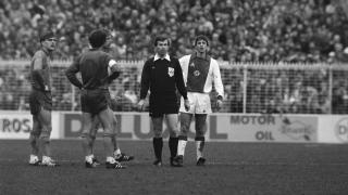 Jan Keizer in actie tijdens de Eredivisiewedstrijd Ajax - Haarlem in 1981. Rechts van hem loopt Johan Cruijff. — Foto: Nationaal Archief.