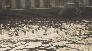 Het Nederlands elftal vermaakt zich tijdens de Olympische Spelen van 1912 in een Zweeds zwembad.