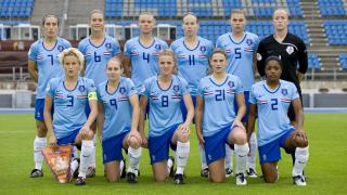 De Oranjevrouwen voor Nederland-Denemarken. Staand v.l.n.r.: Kiesel-Griffioen, Hoogendijk, Meulen, Smit, Hogewoning, Geurts. Zittend vlnr: Koster, Melis, Van de Ven, De Ridder, Bito. — Foto: KNVB Media