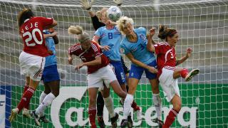 Een luchtgevecht voor het doel van Oranje-keeper Loes Geurts. — Foto: KNVB Media