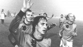 Het Nederlands elftal maakt een ereronde na het laatste kwalificatieduel tegen België. Cruijff loopt mee, maar gaat niet mee.