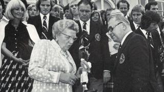 Koningin Juliana ontvangt het Nederlands elftal na het succesvolle WK 1974 op Paleis Soestdijk.