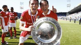 Uitzinnige PSV'ers Hector Moreno en Andres Guardado met de schaal van vorig seizoen.