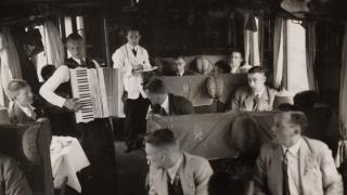 — International Jaap Mol vermaakt zijn ploeggenoten met zijn accordeon tijdens de lange treinreis.