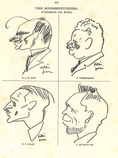Karikaturen van bondsbestuurders, te vinden op pagina 111 in het jubileumboek.