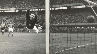 De Deense keeper duikt naar de hoek, maar ziet de bal naast gaan tijdens Nederland-Denemarken in 1953.