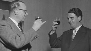 Bondsvoorzitter Hans Hopster van de KNVB (links) en Egidius Joosten van de NBVB toosten op de fusie tussen beide bonden.