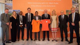 V.l.n.r.: minister Bruno Bruins, Anouk Hoogendijk, Aron Winter, minister-president Mark Rutte, Kushal Das (secretaris-generaal AIFF), Gijs de Jong (secretaris-generaal KNVB), minister Sigrid Kaag, Fons Stoelinga (Nederlandse ambassadeur) en Hans de Boer (voorzitter VNO-NCW).