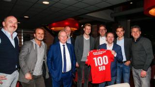Uit handen van Kick van der Vall ontvangt het bestuur van SEO een FC Twente-shirt vanwege het jubileum. — Foto: FC Twente