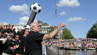 — Foto: Michael van Praag op de KNVB-boot tijdens de Gay Pride in 2013.