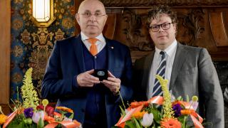 Michael van Praag ontving de Jillis Bruggeman Penning uit handen van de Schiedamse wethouder Stam - Foto: KNVB Media